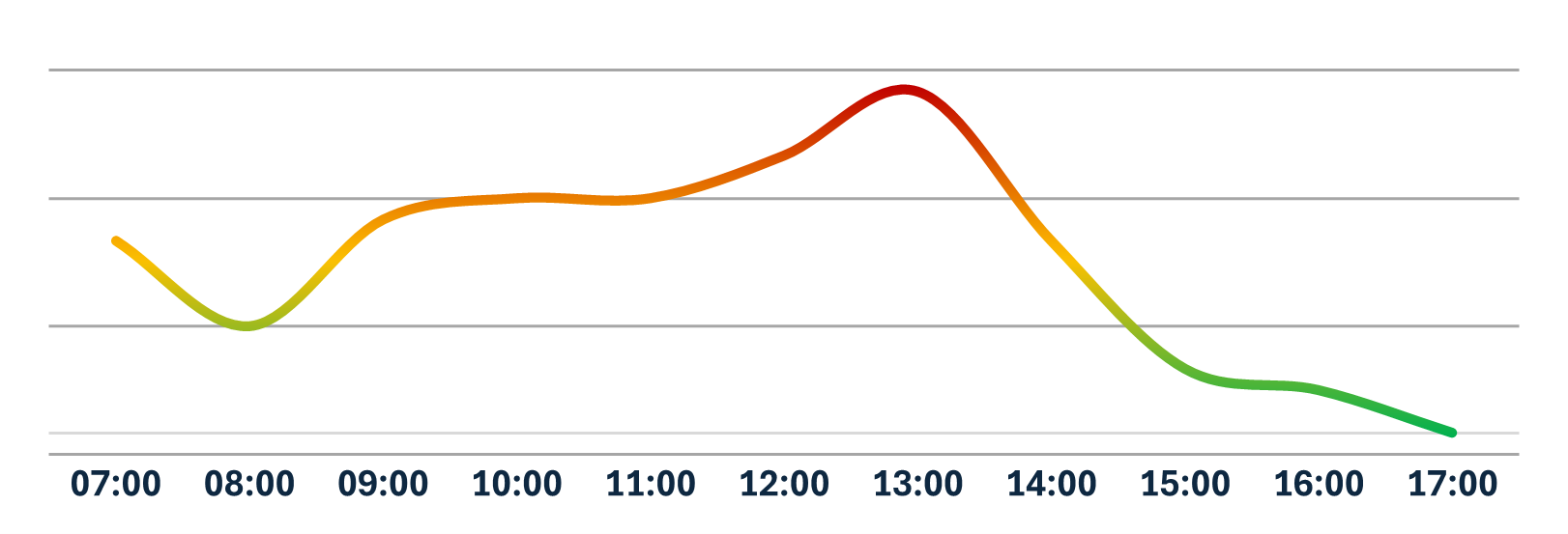 Az alábbiakban a Medistri CH hétfőtől péntekig tartó átlagos forgalmi áramlásának grafikus ábrázolása látható. A görbe a legforgalmasabb és a legkedvezőbb időszakokat mutatja az áruk fel- vagy lepakolásához a történelmi adatok alapján.